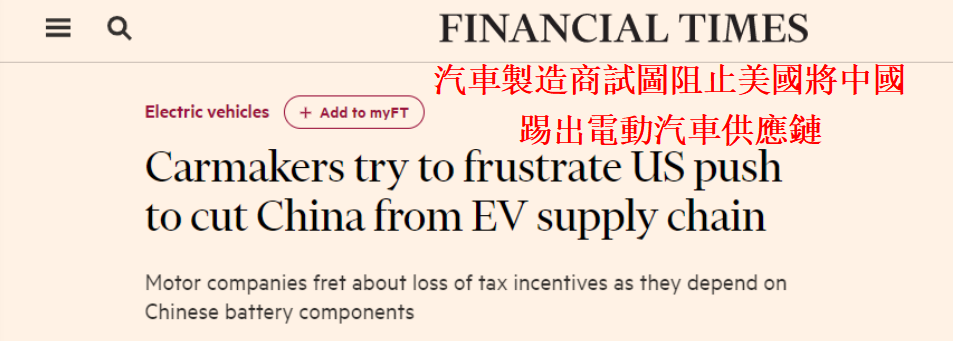 英國《金融時報》報道截圖 美國總統拜登的《2022年通脹削減法案》(Inflation Reduction Act)向北美製造的電動汽車提供了“慷慨”的稅收減免。有關電池原產地、電池組件和製造電池所需關鍵材料的新規定將從 2024年開始分階段生效。 也就是說,從2024年起,美國政府向購買二手電動汽車的美國人提供4000美元的稅收抵免,購買全新電動汽車的消費者則可以獲得7500美元的稅收抵免。 享受兩項補貼的前提是,美國消費者購買的電動汽車產品必須在北美製造,不得有任何“由外國相關實體”(中國、俄羅斯、伊朗和朝鮮)所製造或組裝的電池組件,車用電池中至少有40%金屬原料和礦物(例如鋰和鈷)要在美國或者與美國簽署自由貿易協定的國家開采、提煉等。