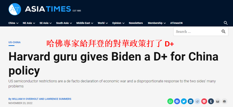 香港《亞洲時報》報道截圖 報道稱,薩默斯主持了該研討會,他向歐文霍特提問:“目前,越來越多的人讚同將中國視為競爭對手,并尋求在多個問題上對抗中國,他們認為在技術方面孤立中國對美國保持領導力十分重要。您對美國未來5年的中國政策有何建議?您對拜登政府的美國政策打多少分呢?” 歐文霍特表示,自己只能給拜登政府的對華政策打“D+”,并給特朗普政府打“D”。他的理由如下: 美國在冷戰期間專注於發展經濟并創建了一個讓各盟友都可以參與的系統。蘇聯卻將所有的錢都投入了軍事,這最終導致了其破產。然而如今,在特朗普-拜登時代(拜登進一步擴展了特朗普的政策),美國卻轉向了保護主義。 美國希望每個人都加入其經濟聯盟,但自己卻不願付出任何代價,也不允許他人進入市場,這將傷害美國的經濟。