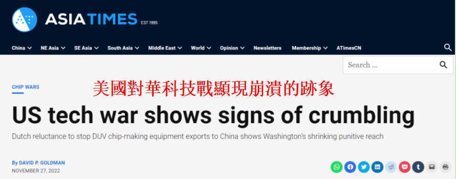 香港新聞網11月28日電 香港《亞洲時報》27日發表題為《美國對華科技戰顯現崩潰的跡象》的文章。文章稱,由於“沒有人加入”,美國自冷戰以來對華最嚴厲的科技封鎖,已經顯現出崩潰跡象。荷蘭拒絕向美國政府“屈服”,日本對美國強加的指令感到厭倦,甚至美國的芯片巨頭也在嘗試繞過禁令繼續與中國進行貿易。