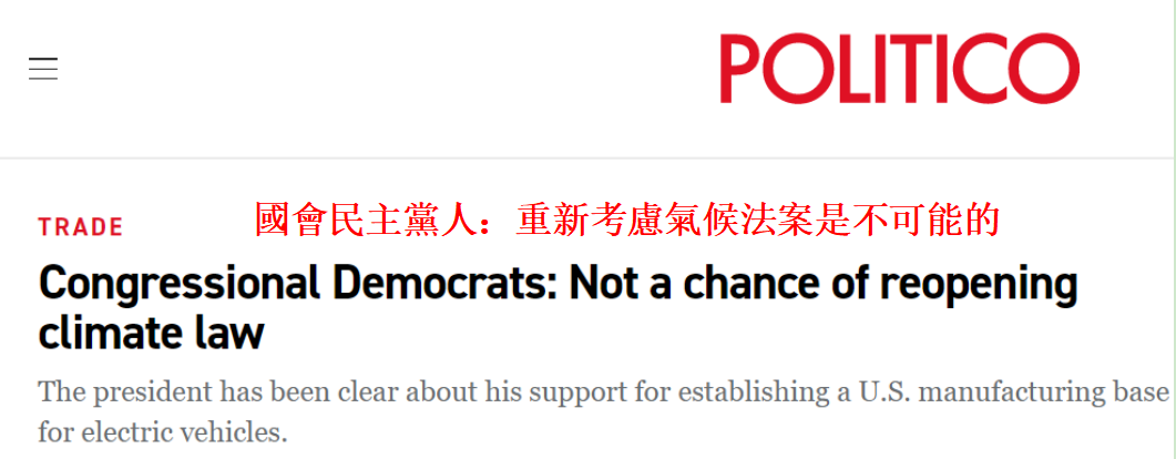 美國《政治》網站報道截圖 文章稱,馬克龍利用本周訪問華盛頓的機會,“請求”美國總統拜登修改《通脹削減法案》。 該法案準備向美國綠色產業提供3690億美元的補貼,以及為北美製造的電動汽車提供了巨額的消費稅抵免。歐洲方面認為,該法案是歧視歐盟電動汽車製造商和清潔能源行業。 圍繞該法案的鬥爭正在對跨大西洋貿易關係構成新的威脅。雖然美國的民主黨人曾大談與盟友進行經濟合作的“必要性”,但現在歐盟卻很難在國會山上找到同情他們的“傾聽者”。 法國和其他歐洲國家正團結起來對抗該法案。馬克龍強調,《通脹削減法案》不符合世界貿易組織的規則。 法國外貿部長奧利維爾·貝齊表示,如果美國不對法案做出修改,歐盟可能會訴諸“脅迫性”的貿易措施。