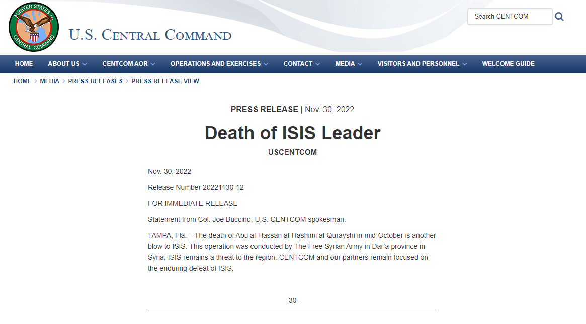 美國中央司令部網站截圖 美軍補充說,這次行動是由敘利亞反政府武裝在敘南部省份德拉進行的,美軍並未參與其中。 聲明稱,“庫萊希10月中旬的死亡是對‘伊斯蘭國’的又一次打擊。” 美國中央司令部說,“伊斯蘭國”仍然是該地區的威脅。中央司令部和我們的夥伴仍然聚焦於持久性地打敗“伊斯蘭國”。 白宮國家安全委員會戰略溝通協調員約翰·柯比當天在記者會上表示,美國對“伊斯蘭國”頭目被消滅的消息表示歡迎。 極端組織“伊斯蘭國”也確認了庫萊希死亡的消息。“伊斯蘭國”組織發言人在11月30日公佈的音頻中說,“該組織首領阿布·哈桑·哈希米·庫萊希最近戰死”。 據悉,庫萊希是今年被打死的第二名“伊斯蘭國”頭目。今年2月3日美國總統拜登發表聲明稱,阿布·易卜拉欣·哈希米·庫萊希在美軍2月2日晚於敘利亞西北部極端分子控制區的“定點清除”行動中自殺身亡。隨後, 阿布·哈桑·哈希米·庫萊希繼任該組織首領。 據悉,阿布·易卜拉欣·哈希米·庫萊希和阿布·哈桑·哈希米·庫萊希彼此之間並無親緣關係。他們使用的均為假名,且“庫萊希”不是其姓名的一部分,而是伊斯蘭教先知穆罕默德所在的部落名稱。 據報道,2019年10月,“伊斯蘭國”首任頭目阿布·貝克爾·巴格達迪在敘利亞一次美軍針對他的軍事行動中自殺身亡,阿布·易卜拉欣·哈希米·庫萊希成為第二任頭目。兩人均為伊拉克人。阿布·哈桑·哈希米·庫萊希是“伊斯蘭國”成立以來的第三任頭目,但外界對於這名“伊斯蘭國”的新頭目知之甚少。(完) 【編輯:李雪萍】