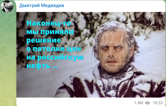 梅德韋傑夫12月3日在Telegram上所發帖子的截圖 “Vesti.ru”新聞網描述稱,在梅德韋傑夫發布的《閃靈》劇照中,男主人公傑克·托蘭斯看起來在雪天裏挨凍、頭發和臉上有雪和冰。 梅德韋傑夫還給這張圖配文稱:“我們終於作出了關於對俄羅斯石油設置價格上限的決定……” 七國集團和澳大利亞本月12月2日宣布對俄出口石油設置每桶60美元的價格上限,最快12月5日生效。 歐盟成員國同日達成一致,同意對俄羅斯海運出口的石油設置每桶60美元的價格上限。 該協議須經書面程序正式批準,相關細節定於12月4日公布。 俄羅斯國家杜馬(議會下院)國際事務委員會主席列昂尼德·斯盧茨基警告,歐盟對俄出口的石油設置價格上限是在危害歐盟自身能源安全。 【編輯:许丰悦】