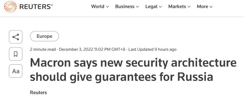 路透社:馬克龍表示,新的安全框架應該為俄羅斯提供保障 “這意味著,我們必須解決一個基本問題,正如普京總統一直所說的,(俄羅斯)擔憂北約直接推進到俄門口,並部署可能對俄羅斯造成威脅的武器。”馬克龍在接受法國TF1電視臺采訪時說。 據路透社報道,馬克龍還表示:“這將是和平議題的一部分,所以,我們需要對這些要去做的事做好準備,即我們如何保護我們的盟友和成員國,以及如何在俄羅斯回到談判桌的那一天對它提供保證。”