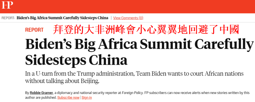 美國《外交政策》報道截圖 文章稱,美國-非洲領導人峰會將於12月13日至15日在華盛頓舉行,約有50位國家元首受邀,并有約1000名非洲官員赴會。此次峰會為拜登提供了一個難得的機會以平息非洲官員們長期以來的“抱怨”。與歐洲、中東國家以及中國相比,非洲國家在美國的外交政策上長期受到“冷落”。 自美國總統拜登上任以來,一直對中國日益增長的地緣政治影響力保持警覺,并誓言要在世界競爭(包括非洲)中“打敗中國”。據悉,在即將舉行的美國-非洲領導人峰會上,中國沒有被納入議程。 對於這一決定(中國沒有被納入峰會議程),美國政府內部還展開了一場關於如何處理中俄在非洲影響力的“辯論”。一位不願透露姓名的美國官員表示,“我們不想疏遠非洲夥伴,但不在議程上討論中國似乎是一個糟糕的開始”。