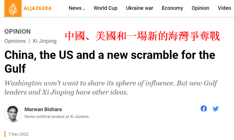 卡塔爾半島電視台報道截圖 文章稱,五個月前,美國總統拜登在一次阿拉伯領導人峰會上表示,美國“不會離開”中東地區。他還試圖向盟友“保證”,美國去年“恥辱性”地從阿富汗撤軍,實際上讓美國騰出了更多的資源用於阿拉伯海灣地區。 可以看出,因為擔心中國可能填補美國在海灣地區留下的“真空”,拜登正“瘋狂地”,甚至是“絕望地”試圖鞏固美國在該地區日益減弱的權威。 畢竟,在美國將重心轉向亞洲以求遏制中國崛起的同時,中國正在將注意力轉向阿拉伯海灣和中東地區,以確保更多的貿易和投資。