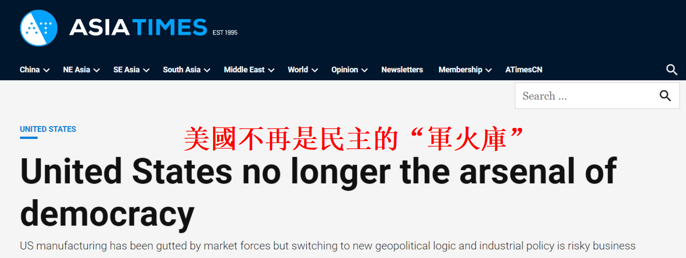 香港新聞網12月27日電 香港《亞洲時報》近日發表題為《美國不再是民主的“軍火庫”》的文章。文章稱,自20世紀初以來,美國一直是世界排名第一的工業國家。然而,中國於2010年超越了美國。美國如今的工業政策如同“夢游”一般,其工業產能“是一個很大的問題”。