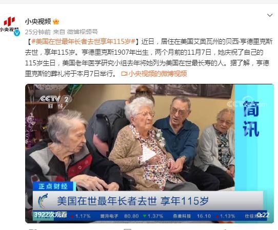 亨德里克斯1907年出生,兩個月前的11月7日,她慶祝了自己的115歲生日,美國老年醫學研究小組去年將她列為美國在世最長壽的人。據了解,亨德里克斯的葬禮將於本月(1月)7日舉行。(完)