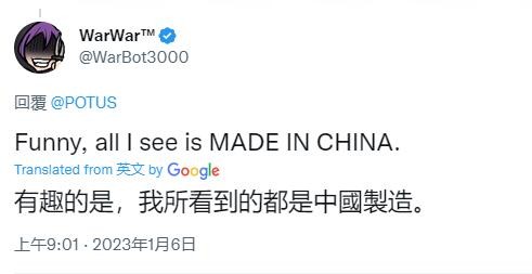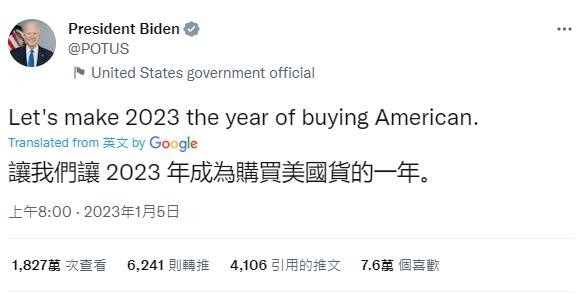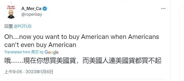 香港新聞網1月6日電 美國總統拜登昨天(5日)在社交媒體推特上發文,“我們來讓2023年成為購買美國貨的一年。”然而,拜登“熱情洋溢的呼籲”,換來的卻是一場美國網友的“吐槽大會”。 大批美國網友瘋狂吐槽美國物價高,高呼美國貨“買不起”,不少人還藉此為“中國製造”打call:“我們買的起的大部分東西都是‘中國製造’”、“我們的大部分藥品都是‘中國製造’”,場面一度相當尷尬!