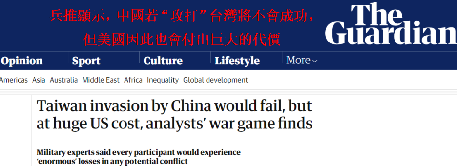 英國《衛報》報道截圖 文章稱,美國智庫“國際戰略研究中心”日前召集了一些軍事專家對“台海衝突”進行了兵棋推演。結果顯示,每一個可能直接參戰的國家或地區,包括中國,中國台灣地區、美國、和日本,都將遭受“巨大”的損失。 “國際戰略研究中心”是現在美國國內規模最大的國際問題研究機構。 兵推結果顯示,隨著中國“進攻”的開始,中國導彈可能會摧毀美國在日本以及關島的空軍基地,并擊沉兩艘美國航空母艦和10至20艘驅逐艦和巡洋艦。 來自麻省理工學院的安全專家埃里克·海金波坦稱,“我們得出了兩個結論。首先,在大多數情況下,中國都不太可能實現其戰略目標或‘佔領’台北。其次,戰爭的成本對於所有參與者來說都是十分高昂的,當然也包括美國”。