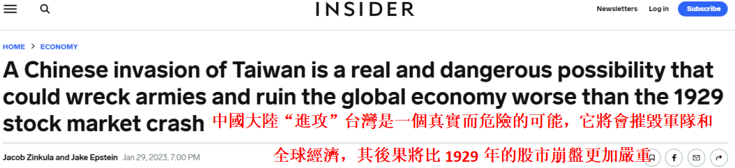 美國《商業內幕》報道截圖 文章稱,去年10月,美國國務卿布林肯表示,中國大陸可能將收複台灣,其時間或“比之前想象的要近得多”。美國國防部在《2022中國軍力報告》中寫道,中國大陸明顯“加強”了對台灣的軍事、外交和政治壓力,并增加了“挑釁和破壞穩定的行動”。 一些專家表示,無論中國大陸何時“進攻”台灣,這都可能對捲入衝突的軍隊和全球經濟造成“毀滅性的打擊”。 目前,美國已經為台灣配備了防空系統,反艦導彈和戰鬥機等全套武器,如果中國大陸“進攻”台灣,美國無需進行干預。但是,美國總統拜登已經打破了“戰略模糊”,并表示如果中國發動“進攻”,美國將出兵“保衛”台灣。這意味著如果台海戰爭爆發,局勢將很快陷入混亂。
