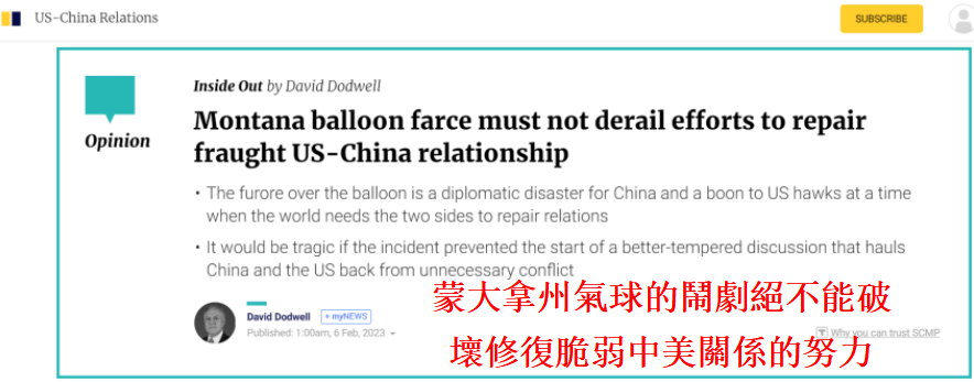 香港《南華早報》報道截圖 文章稱,有時候,悲劇會演變為鬧劇,然後進一步惡化為更深刻的悲劇。例如,中國的氣球在緩緩飄過美國中部時引發的這場“混亂”。 在“中國氣球”事件發生後,美國國務卿布林肯取消了對中國的訪問計劃,這是五年來美國首次對中國進行該級別的訪問。隨著該訪問的叫停,修複中美關係的機會被破壞了,取而代之的是美國共和黨與民主黨爭奪“誰對中國更強硬”。 無論該氣球是在“監視”蒙大拿州的核設施,還是在平流層中被推離了航線,這都是一場外交“災難”。 但對於美國“鷹派”來說,這絕對是一個“禮物”。他們通常將中國描述成一個積極擴張的超級大國,并致力於在未來兩三年內“迫使”美國為台灣而戰。 儘管該氣球不會對美國的安全構成威脅,但這一事件將永遠成為美國“鷹派”言論的一部分。