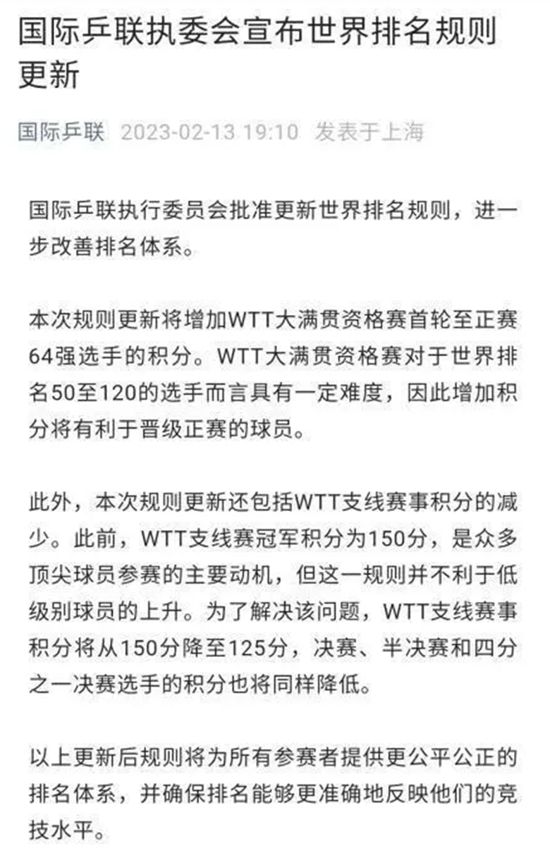 國際乒聯微信公眾號截圖 本次規則更新將增加WTT大滿貫資格賽首輪至正賽64強選手的積分,對晉級正賽的球員有利。而考慮到低級別球員的上昇難度,本次規則更新還包括減少WTT支線賽事的積分,從150分降至125分,決賽、半決賽和四分之一決賽選手的積分也將同樣降低。