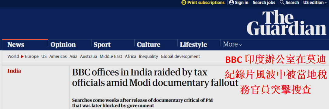 英國《衛報》報道截圖 英國《衛報》引述BBC工作人員的話說,本周二(14日)上午,印度稅務部門的十幾名官員“突襲”了BBC位於印度德里和孟買的辦公室,并在那裡進行了一項“調查”。幾名BBC記者的文件和電話被沒收,辦公室也被查封。 一些印度官員對當地媒體稱,本次搜查是針對BBC在印度的業務進行“逃稅”調查的一部分,他們沒收了幾個賬戶和一些財務文件。 迄今為止,英國政府拒絕就此發表評論,不過一名英國外交部官員表示,他們已經與 BBC進行了交談。 BBC此前一直不願意在涉及此類事件時尋求正式的政治支持,以試圖證明它“獨立”於英國政府。