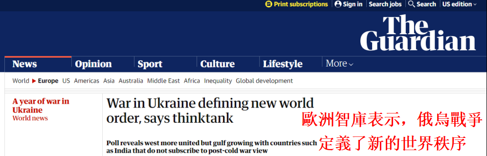 英國《衛報》報道截圖 英國《衛報》報道,這項調查包括了九個歐盟成員國(法國、德國和波蘭等),還包括英國,美國,中國、俄羅斯、印度和土耳其。 調查顯示,各國民眾對於戰爭、民主和全球力量平衡的看法具有明顯的地域差異,這說明俄烏戰爭可能是一個歷史性的轉折點,它標誌著“後西方”世界秩序的出現。 該智庫負責人、該報告的作者之一馬克·倫納德表示,“俄烏戰爭的悖論在於,西方比以往任何時候都更加團結,但其影響力卻比任何時候都弱小”。 調查顯示,西方對俄羅斯的看法在過去一年變得更加強硬。英國(77%)、美國(71%)和九個歐盟國家(65%)的大多數人都視俄羅斯為他們的“對手”。 “歐洲外交關係委員會”表示,與去年一項類似的調查相比,俄烏戰爭如今被更多的西方人視為是一場爭取民主和自身安全的鬥爭。在美國,36%的受訪者表示支持烏克蘭主要是出於捍衛美國民主的需要,而44%的英國受訪者和45%的歐盟九國受訪者認為支持烏克蘭是為了捍衛自己的國家安全。