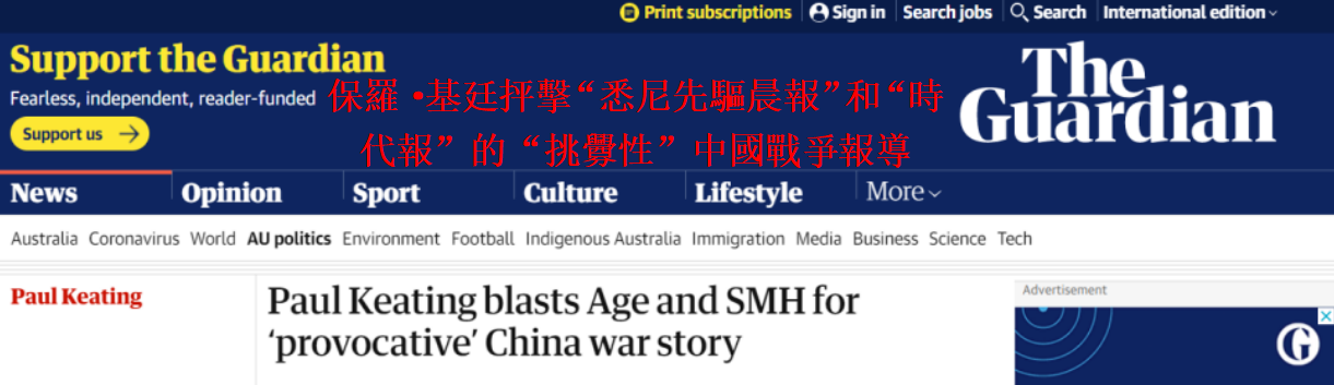 香港新聞網3月7日電 當地時間3月7日,澳大利亞最大的兩家報紙在其頭版發佈消息,“警告”稱“澳大利亞將在三年內與中國開戰”。澳大利亞前總理保羅·基廷對此批評道,這是他從政50多年來,見到的“最令人震驚和最具挑釁性的新聞報道”。