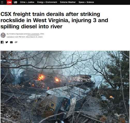 美國有線電視新聞網(CNN)報道截圖 事故發生在偏遠地區。火車撞上一塊因山體滑坡掉落的巨石脫軌,部分車廂墜入河中。火車頭在劇烈碰撞後起火,車上3名列車人員受傷,目前沒有生命危險,已被送往醫院治療。 據報火車是CSX運輸公司的一列運煤火車,但事故發生時,車上並沒有運載任何煤炭。 西弗吉尼亞州應急管理部門其後發布聲明指,至少22節空車廂脫軌,一節動力車廂脫軌後掉進附近河中,造成柴油洩漏。該部門表示,事故發生地為美國新河峽谷國家公園保護區以南地區。 CSX公司將負責善後清理,目前正在監測洩漏的柴油是否存在任何潛在的公共健康影響。該公司補充說:“脫軌車廂洩漏的柴油數量不明,將在新河採取環保措施。” 2月3日,諾福克南方鐵路公司一輛貨運列車駛經俄亥俄州東巴勒斯坦鎮時發生事故,共50節車廂脫軌或損壞。事故導致大量有毒化學品進入空氣、水和土壤,對周邊生態環境和居民健康造成危害。3月4日,另一列貨運火車在俄亥俄州斯普林菲爾德市附近發生事故,約20節車廂脫軌。(完) 【編輯:胡雪石】