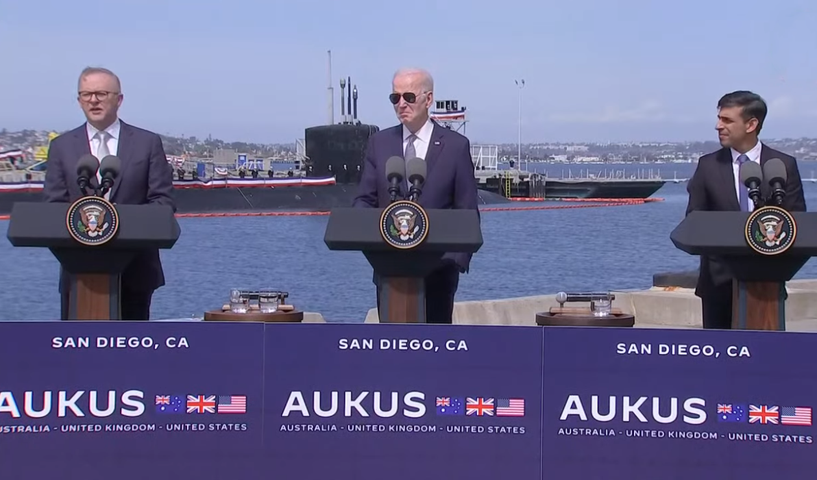美英澳核潛艇合作 多國表示反對香港中通社3月14日電 當地時間3月13日,美國總統拜登在加州聖迭戈美國海軍基地與澳大利亞總理阿爾巴尼斯以及英國首相蘇納克舉行會面,就所謂“三邊安全夥伴關係”舉行會談,並公佈了為澳大利亞配備核潛艇的計劃。