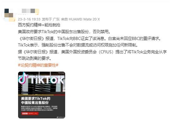 香港新聞網3月17日 太魔幻了!美國不禁毒,不禁槍,卻要費盡心思地禁止一個來自中國的短視頻軟件! 近日,多家美媒報道,美國政府以“國家安全”為由,要求中國抖音海外版TikTok的中國股東字節跳動出售所持有的TikTok股份,否則將會全面封禁。對於美國的無恥行徑,網友怒了:“難道美國的契約精神就是明搶?”