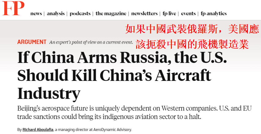 美國《外交政策》報道截圖 文章稱,如果中國向俄羅斯提供武器,將改變世界,因為中國擁有足够的物資儲備和工業生產能力,彌補俄羅斯在俄烏戰爭中的損失。更“糟糕”的是,這將有助於鞏固中俄同盟,一個與西方利益相對立的同盟。 美國總統拜登和其他西方領導人“警告”,如果中國向俄羅斯提供致命性的技術援助,將造成“嚴重的後果”。 事實上,西方確實還有一些“手段和影響力”,比如讓中國的商用飛機製造業停滯,這將打擊中國在經濟、技術和交通方面的雄心。 航空業不僅是一個關於尊嚴的問題,還是中國基礎設施的根本,也是許多中國中產階級必不可少的交通工具。世界銀行的數據顯示,2000年至2019年,中國的空中客運量增長了十倍以上,從6200萬人次增加到了6.6 億人次。 美國及其盟友已經決定在半導體和電信系統方面與中國“脫鈎”,那麼噴氣客機的製造將是“合乎邏輯”的下一步。畢竟,中國引以為傲的商用運輸機都“嚴重依賴”西方進口的技術和系統。雖然中國希望開發國產替代品,但這將是一條“漫長”的道路。
