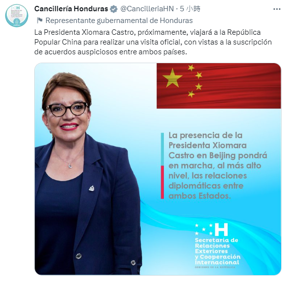 中國日前與洪都拉斯建立外交關係,洪都拉斯政府承認世界上只有一個中國,中華人民共和國政府是代表全中國的唯一合法政府,台灣是中國領土不可分割的一部分。