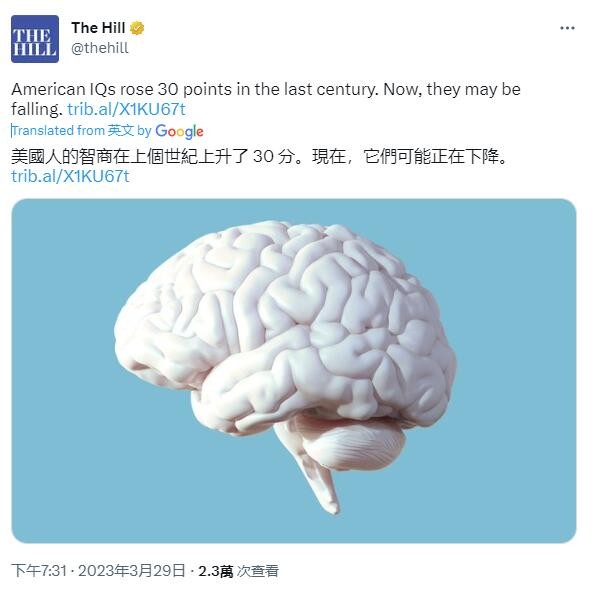 香港新聞網3月30日電 昨日(3月29日),專門研究國會和白宮事務的美國網站《國會山報》(TheHill),煞有介事地刊登了一篇最新研究報告。該報告警告稱,美國人的智商在上個世紀上昇了30分,但是,現在它正在下降。 這一結果似乎是在美國網友意料之中,有人表示“這是今天看到的最不令人感到驚訝的標題”,有網友表示“感謝特朗普!”還有人聯繫美國國內的毒品泛濫,“好傢夥,再吸多點毒品!”有中國網友第一時間想到了美國國會議員把TikTok聽證會辦成科普會的表現,表示“看(美國)那些國會議員就知道了”。