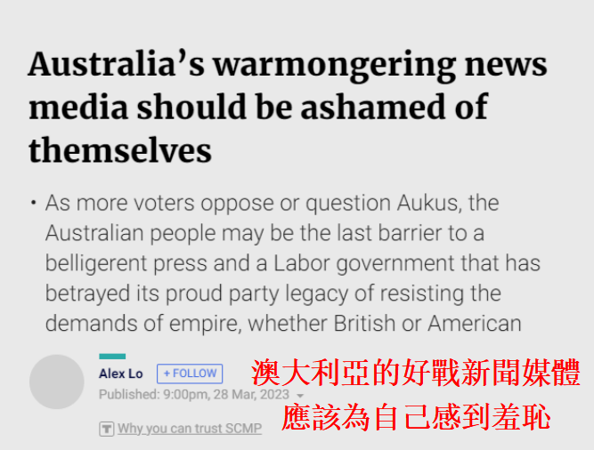 香港《南華早報》報道截圖 “美英澳三邊安全夥伴關係(AUKUS)”就是“帝國”和“媒體”相結合的最好例證。無論是價格高昂的“核潛艇交易”,還是“美帝國”事實上接管了英國和澳大利亞在亞太地區的軍事和外交政策,AUKUS都應該成為研究這些國家的主流媒體是如何運作的“經典案例”。實際上,這些媒體已經被其政府選中,并成為了與中國發生潛在戰爭的“拉拉隊員”。 除了少數例外,美國和英國的新聞媒體長期以來一直是“戰爭媒體”,它們的作用是為本國政府挑起的武裝衝突提供辯護并使其合法化,是為了麻痹公眾和阻止國內反對的聲音。 本月初,澳大利亞《悉尼先驅晨報》和《時代報》聯合發佈了臭名昭著的“紅色警報”系列文章,這是澳媒好戰行為中“最新、最明目張膽的例子”。 事實上,這些報紙歸澳大利亞媒體巨頭“第九娛樂”所有,它控制著該國的大部分廣播、電視、報紙和數字媒體,在過去五年中一直“散佈虛假信息”。“第九娛樂”的競爭對手,由魯珀特·默多克控制的澳大利亞新聞集團也是如此。