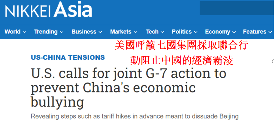 香港新聞網4月3日電 日本《日經新聞》昨日(2日)發表題為《美國呼籲七國集團采取聯合行動阻止中國的經濟霸淩》的文章。文章稱,如果中國對七國集團(G7)成員國進行“經濟脅迫”,美國將推動G7采取聯合行動,以阻止中國的“經濟霸淩”。