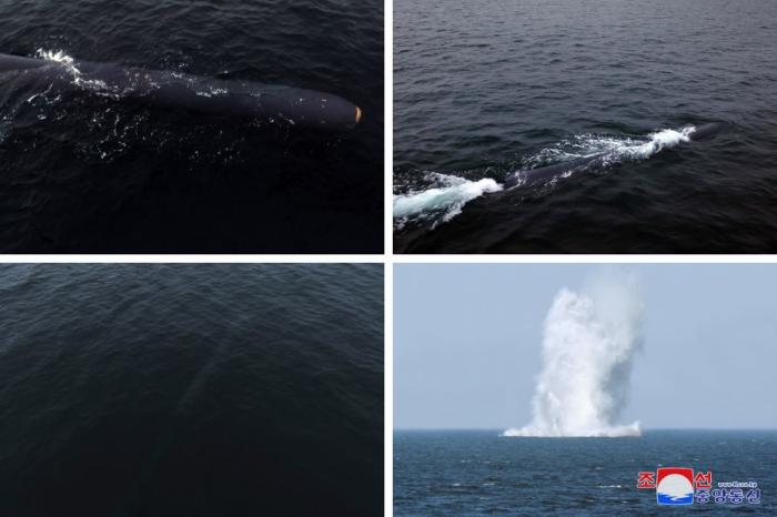 3月25日至27日,朝鲜进行潜水式战略武器系统试验。图片来源:朝中社 上月25日至27日,朝鮮也曾進行了潛水式戰略武器系統試驗。 3月25日下午,朝鮮核無人潛水攻擊艇“海嘯-1”型在元山灣進入試驗,沿著在朝鮮東海設定的模擬600公里界限距離的之字形及橢圓形航線潛航41小時27分,3月27日上午到達鹹鏡北道花台郡前海預定目標水域,且試驗用戰鬥部在水下成功爆炸。