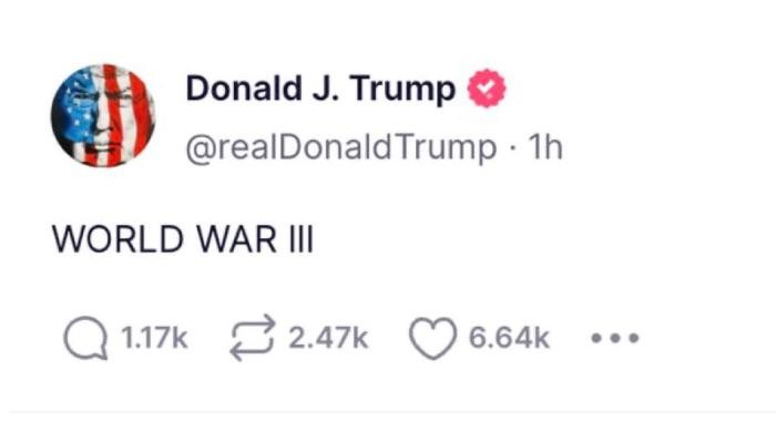 據外媒報道,美國前總統特朗普9日在社交媒體平台上寫道:“第三次世界大戰。”這是他自2022年底宣布競選美國總統以來,至少第5次發表此類言論。