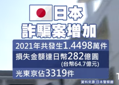 日本警方統計騙案損失數據。製圖:TVBS新聞台 近年此類電信騙案頻傳,據日本警察廳統計,近2021年因電信詐騙造成的損失高達282億元,受害者多集中於都會區。日本警方製作大量防騙指引和宣導影片提高民眾防騙意識,今年1月日柬兩國警方合力共同打擊犯罪,最終查出19人至少涉及數十宗詐騙案。 (完) 【編輯:王軼南】