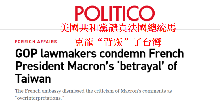香港新聞網4月12日電 美國“政客”網站近日發表題為《美國共和黨譴責法國總統馬克龍“背叛”了台灣》的文章。文章稱,馬克龍在結束訪華行程後稱歐洲不應捲入台灣問題的言論,令美國感到“震驚”。美國共和黨人譴責馬克龍“背叛”了台灣,有共和黨議員甚至呼籲重新評估美法關係。