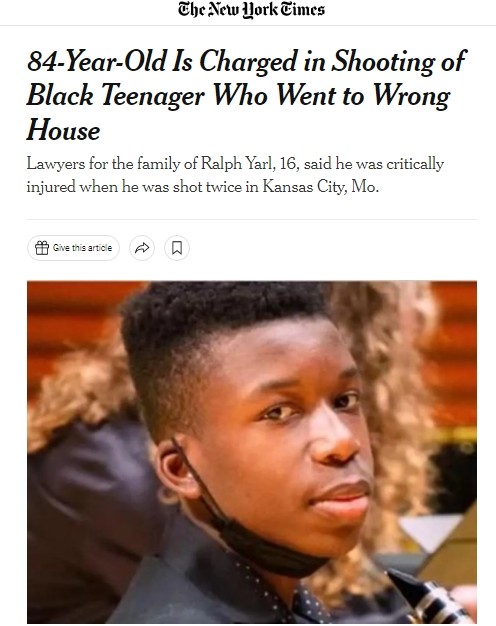 圖片來源:紐約時報報道截圖 據《紐約時報》報道,16歲少年亞爾的律師表示,13日晚10點左右,亞爾去朋友家接他弟弟時因弄錯地址按錯了門鈴,一名白人男子開槍擊中他的頭部和手臂。 亞爾中槍,受傷嚴重,隨後被立即送往醫院急救。開槍的戶主為84歲的萊斯特,被警方拘留24小時後獲釋。 亞爾家的律師克倫普和梅里特在一份聯合聲明中寫道,“在承認槍擊了一名手無寸鐵且沒有威脅的按門鈴的少年後,沒有任何藉口可以釋放這名攜帶武器的危險嫌疑人。”他們在聲明中稱,總統拜登已經給亞爾的家人打了電話,並為他的健康和正義祈禱。 “必須停止針對手無寸鐵的非裔的槍支暴力,我們的孩子應該感到安全,而不是像獵物被獵殺一樣。”聲明中寫道。 美國副總統哈里斯也在社交媒體推特上發文稱,“任何孩子都不應該生活在因按錯門鈴而被槍殺的恐懼之中。” 事件曝光後,17日,在坎薩斯城引發了一場抗議活動,數百人聚集在他被槍擊的房子外面,一邊遊行,一邊高呼“非裔生命受到攻擊”和“黑人的命也是命”。他們舉著標語,上面寫著“按門鈴不是犯罪”。 隨著憤怒在社區蔓延,克萊縣檢察官湯普森17日下午宣布,白人戶主萊斯特被指控兩項重罪:一級襲擊罪和武裝犯罪行動罪。湯普森稱,如果一級襲擊罪名成立,萊斯特可能面臨終身監禁。而武裝犯罪行動罪指控成立,最高可判處15年監禁。 據介紹,亞爾為人善良且擅長音樂,2月時,曾因演奏低音單簧管而獲得密西西比州的全州樂隊榮譽獎,他還在大都會青年樂團演奏多種樂器。 目前,亞爾已出院回家。克倫普表示,亞爾仍在與這場磨難帶來的壓力作鬥爭,希望亞爾能完全康復。 美國槍支氾濫,槍擊案頻發,近年來死於槍支暴力的人數呈總體上升趨勢。美國“槍支暴力檔案”網站資料顯示,截至4月17日,美國2023共發生至少162起大規模槍擊事件,因各類涉槍事件死亡的人數高達12354人,另有9596人受傷。(完) 【編輯:關秀英】