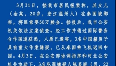 香港中通社4月19日電 泰國傳媒19日報道,泰國警方日前拘捕6人,涉嫌綁架1名中國商人,勒索400萬泰銖(1泰銖約合0.029美元)贖金。