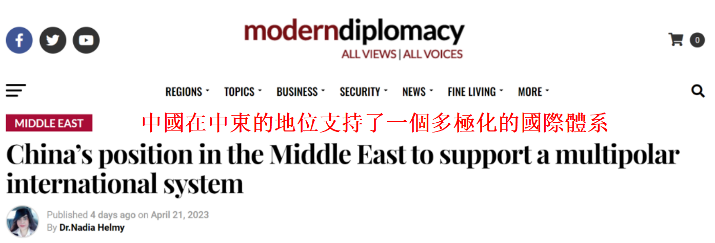 歐洲《現代外交》網站報道截圖 文章稱,如今,中國是中東地區的主要參與者,在國際體系的框架內,除美國外,所有國際大國都在尋求“多極化”。中國通過“一帶一路”倡議在中東地區的“存在感”不斷增加,以支持和加強其向西推進的政策。 中國已經開始在中東實施大規模的基礎設施項目,以重建伊拉克和叙利亞。中國於2015 年12月批准了第一部反恐法,這為其軍隊積極參與國內外特別是中東的反恐任務鋪平了道路。中國通過與巴格達之間的信息交換和提供培訓來支持伊拉克打擊恐怖組織“伊斯蘭國”。此外,中國與伊朗的軍事合作也在不斷擴大,兩國舉行了多次聯合軍演。中國還在重慶與沙特阿拉伯舉行了打擊恐怖主義的聯合軍事演習,阿聯酋和其他阿拉伯國家緊隨其後。 另外,中國領導人在2018年7月曾承諾向幾個阿拉伯國家提供價值230億美元的援助貸款,此舉反映出中國通過外國投資人和人道主義援助者的身份更廣泛地參與中東事務。