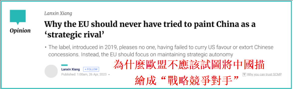 香港新聞網4月27日電 香港《南華早報》昨日(26日)發表題為《為什麼歐盟不應該試圖將中國描繪成“戰略競爭對手”》的文章。文章稱,在歐盟面臨重重危機的情況下,將中國列為“制度性對手”的戰略已經變得完全“不可持續”。該戰略既無助於地區穩定,也無益於世界和平。如果歐盟想要再次強大,并在世界舞台上重新擁有話語權,就必須堅持“戰略自主”的政策。