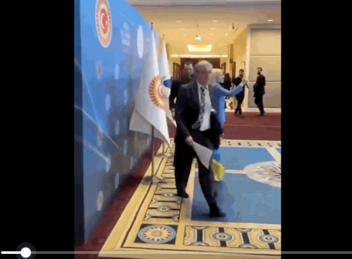 (視頻截圖) 據報道,事件發生在會議場外,一名俄羅斯代表團成員遭攻擊後接受了醫療救助,俄羅斯駐土耳其安卡拉大使館在調查此事。 報道又稱,4日稍早時間,烏克蘭代表團意欲打斷俄羅斯代表團團長季莫菲耶娃在大會上的發言。季莫菲耶娃指,烏克蘭代表團攤開兩面旗子,叫著帶侮辱性的語言挑釁她。 至於肢體衝突事件,從推特流傳的視頻所見,事發於一名穿西裝、戴眼鏡男子快步走向場內插著的一枝烏克蘭國旗,然後用力扯下帶走,很快有一名男子衝向他,並揮拳相向,搶回烏克蘭國旗,雙方一度互相對質。 對此,土耳其議會議長穆斯塔法森托普對正在發生的俄烏代表衝突事情做出了嚴厲的反應:“我們不能在這裡允許這種情況,我們不允許將烏克蘭國旗移除”! 俄方回應稱,烏方行為滑稽無理,“更適合動物園”。(完) 【編輯:李彥洲】