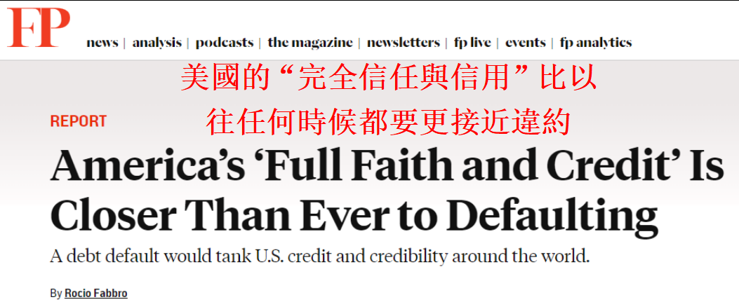 美國《外交政策》報道截圖 文章稱,美國財政部長耶倫最近警告美國國會稱,美國最早可能於今年6月1日出現債務違約。隨著該日期的臨近,如果國會無法就提高債務上限達成妥協,美國乃至全世界都將可能陷入前所未有的金融災難。債務違約還可能導致美元貶值和投資者逃離美國證券市場,這將為美國金融霸權的基礎“完全信任與信用條款”敲響“喪鐘”。 這不是美國政府第一次對債務上限提出異議,自1960年以來,債務上限已上調了78次。2011 年,美國距離突破上限已經近在咫尺。雖然最終沒有違約,但由於嚴重的政治僵局和政府的不穩定,評級機構標準普爾在歷史上首次下調了美國的主權信用評級。 來自喬治敦大學政府事務研究所高級研究員勞拉·布萊辛表示,從那時起,債務上限不僅變成了黨爭,而且變得十分危險。 美國在1月份時就已經達到了31.4萬億美元的債務上限,自那時起,美國財政部采取了“非常規措施”以避免違約的發生。與此同時,儘管危機迫在眉睫,但兩黨試圖達成協議以避免違約的努力一直“沒有效果”。拜登於上周五在白宮表示,“他們(共和黨)試圖利用債務進行挾持,讓我們同意一些非常激進的削減政府開支的措施,削減這些開支將非常困難且具有破壞性。”