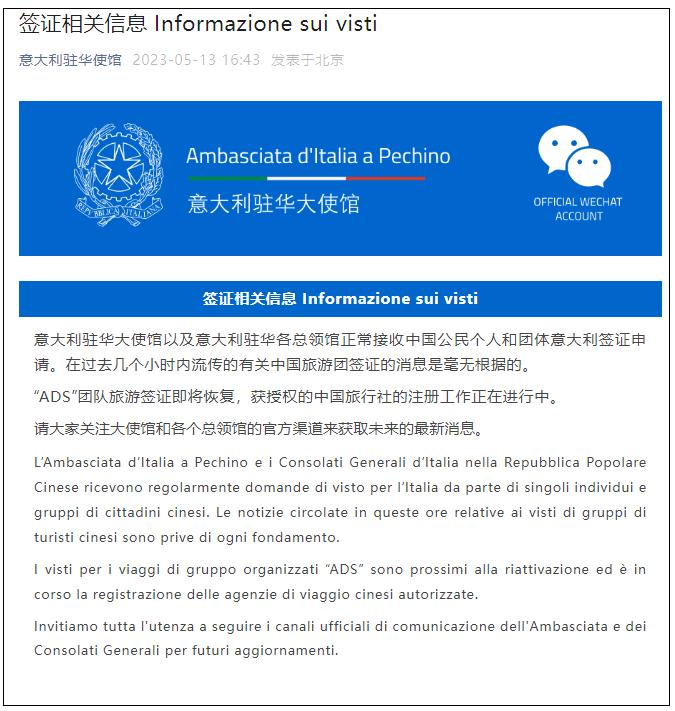 香港中通社5月13日電 近日,中國社交媒體上流傳著“意大利停止團簽及個人簽”的消息。對此,意大利駐華使館於5月13日發布公眾號信息稱,意大利駐華大使館以及意大利駐華各總領館正常接收中國公民個人和團體意大利簽證申請。“在過去幾個小時內流傳的有關中國旅遊團簽證的消息是毫無根據的。”