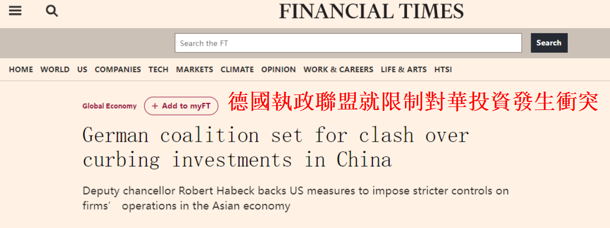 英國《金融時報》報道截圖 文章稱,德國副總理哈貝克支持對在中國的公司進行境外投資審查,并強調德國和美國在對華貿易問題上“日益趨同”。 目前,美國拜登政府正在制定一項法案,以建立一種機制來審查美國公司的境外投資,特別是對華投資。本周,在一次會議上談到美國正考慮實施新的投資限制時,哈貝克表示,“我認為德國也應該這樣做”。哈貝克的發言人於上周五證實,其部門正在研究對外投資審查的影響。 但是,哈貝克的干預可能會讓他與德國的商業團體發生“衝突”,這些商業團體反對在他們與最大的合作夥伴之間“設置更多的障礙”。 另外,這還可能造成德國執政聯盟內部的分歧和緊張氣氛。來自社會民主黨的總理朔爾茨和來自自由民主黨的財政部長林德納對這種出口管制都持有“懷疑態度”。 來自VDMA(德國機械設備製造業聯合會)的專家克勞斯·弗里德里希表示,“到目前為止,我們還沒有看到任何可信的例子說明對外投資將對歐洲的安全造成影響。美國對進行這種境外投資審查的論據也很薄弱”。