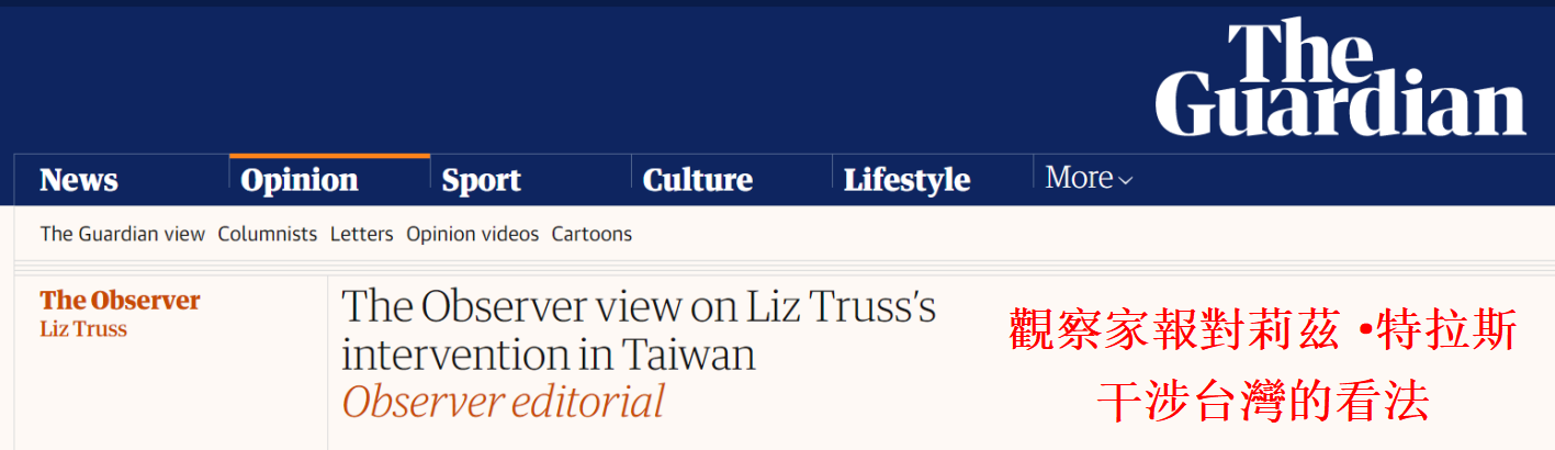香港新聞網5月17日電 英國《觀察家報》(《衛報》周日版)近日發表題為《觀察家報對莉茲·特拉斯干涉台灣的看法》的社論。文章稱,英國前首相特拉斯的竄台計劃被英國議員猛批,台灣人民最不需要的就是特拉斯的“幫助”。如今,連美國都在積極修補與中國的關係,而特拉斯卻在放縱她的傲慢和憤怒。