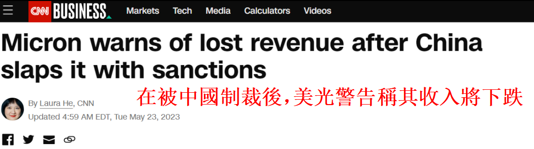 美國有線電視新聞網(CNN)報道截圖 文章稱,美國芯片製造商“美光科技”公司表示,他們被禁止向從事關鍵基礎設施項目的中國公司出售芯片,可能導致年收入損失高達7%-9%。“美光科技”是美國最大的存儲芯片製造商之一,其超過10%的收入都來自於中國。 上周日,中國國家網信辦表示該公司未能通過網絡安全審查。因此,“國內關鍵信息基礎設施的運營者應停止采購美光公司產品”。 本周一,“美光科技”的股價應聲下跌約3%,而該公司在亞洲的競爭對手股價卻有所上漲。中國內存芯片製造商“北京君正”的股價上漲了2.8%,“德明利”飆升了6.3%,“同有科技”則大漲了14%。在首爾,全球最大的存儲芯片製造商之一“SK海力士”的股價上漲了0.9%,跑贏了韓國股市。 文章認為,這顯然是中國對美國及其盟友制裁中國芯片行業的行為所進行的“反擊”。自2022 年10月以來,美國對中國的先進芯片和芯片製造設備實施了全面的出口限制。今年3月,日本和荷蘭這兩個美國的“重要盟友”也宣布限制向包括中國在內的國家出售先進芯片的製造技術。