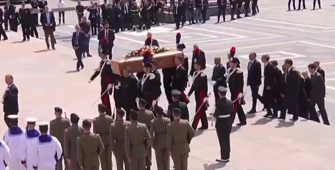 國葬儀式現場 視頻截圖 據外媒消息,葬禮於下午3點舉行,儀式由米蘭大主教馬里奧·德爾皮尼主持,教堂內有約2300人參加儀式。總統塞爾焦·馬塔雷拉、總理焦爾吉婭·梅洛尼和多名前總理等大批政商界人士,及來自伊拉克、匈牙利等國的領導人也出席了國葬。 意政府將當日定為全國哀悼日,所有公共建築物下半旗誌哀。這是意首次為一名前領導人設置全國默哀日。歐洲議會和歐盟委員會也降半旗致哀。 當地警方表示,約有15000人在教堂外通過大屏幕觀看了葬禮儀式。 貝盧斯科尼12日去世,終年86歲。他是傳媒大亨,坐擁電視台及報紙,又涉足球壇,他曾三度出任總理,是第二次世界大戰後意大利任職時間最長的總理。(完) 【編輯:梅婉潼】