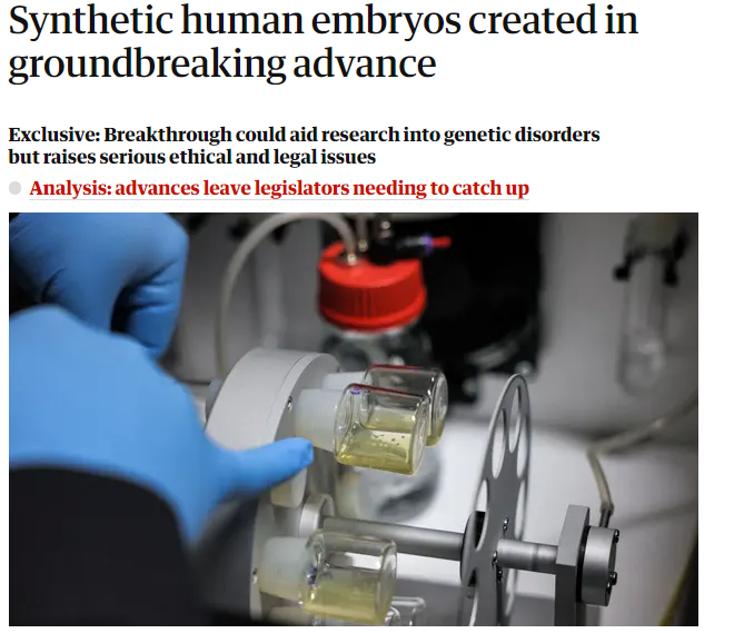 英國《衛報》報道截圖 《環球時報》引述英國《衛報》14日報道稱,該胚胎結構還處於人類發育最早階段,沒有長出心臟和大腦。負責這項研究的科學家稱,這一成果有望為研究遺傳疾病影響和反複流產原因提供關鍵突破口。 然而,這項實驗引發嚴重的道德和法律問題。有科研人士稱,與試管嬰兒具備成熟完善的法律監管體系不同,繞過精子和卵子而直接用幹細胞培育人類胚胎缺乏明確監管,此類研究迫切需要監管體系跟進。目前該合成人類胚胎結構僅限於試管研究,後續能否繼續發育成長還有待觀察。 【編輯:梅婉潼】