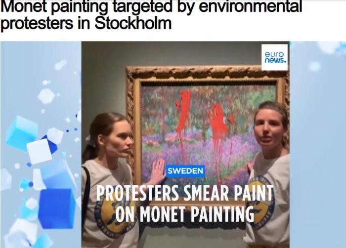 香港新聞網6月16日電 綜合外媒消息,14日,兩名瑞典環保主義者在斯德哥爾摩的瑞典國立博物館,隔著保護玻璃對莫奈畫作塗紅漆,並把手粘在玻璃上。