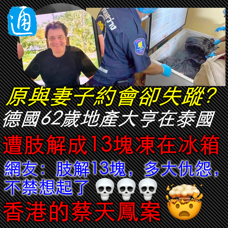 駭人!德國地產大亨在泰國遭肢解成13塊凍在冰箱香港新聞網7月13日電 又一起讓人不寒而慄的案件! 據美聯社報道,德國籍房地產大亨馬克漢斯於7月4日在泰國春武里芭提雅離奇失蹤, 11日被發現時已經“不完整”、遭人用電鋸分屍成13件,放入了塑料袋並藏於一個冰櫃中......