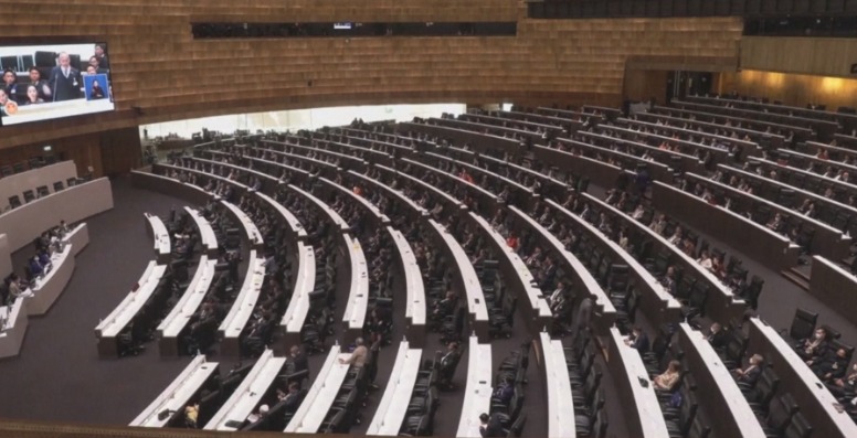 泰國國會 視頻截圖 綜合報道,鑒於監察員就國會決議爭議向憲法法院提出釋憲申請,為避免產生矛盾,已下令推遲原定於7月27日舉行的第三輪總理選舉投票。 另外,有意組建新政府的八個政黨原計劃周二(25日)召開的會議亦宣告取消。為泰黨在短信中稱,聯盟的其他七個黨派也已收到通知。有消息稱,為泰黨已就取消會議向其他政黨道歉。 為泰黨解釋說,它的任務是在國會投票選舉新總理時尋求聯盟外政黨和上議員的支持,但這項任務沒有取得令人滿意的進展。 遠進黨在5月14日的大選贏得國會下議院500個議席中的151席,成為最大贏家。為泰黨拿下141席。 不過,由於得不到軍方任命的250名上議員的支持,遠進黨黨魁皮塔在首輪總理選舉中闖關失敗,在7月19日第二輪表決再遭重挫,皮塔當天也被憲法法院因其之前違反選舉規則而暫停議員資格。皮塔無緣出任總理,只能“讓路”給為泰黨組織政府。(完) 【編輯:梅婉潼】