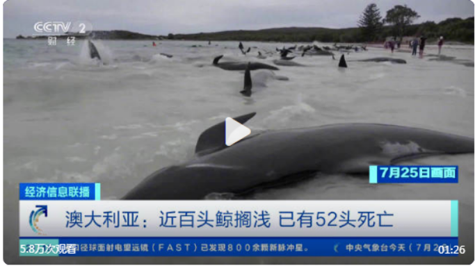 香港新聞網7月27日電 據美聯社報道,澳大利亞政府部門7月26日證實,大約97頭領航鯨在西澳大利亞州海灘擱淺。截至發稿,已經有52頭領航鯨死亡。