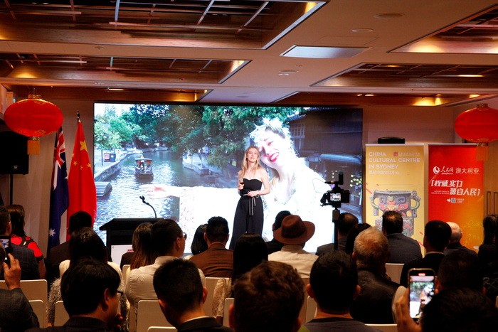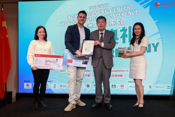 中國駐悉尼總領事周立民為一等獎獲得者柯雅各頒獎(中國文旅部) 經過中澳舉薦人的認真評選和推薦,來自西澳的柯雅各(James Clarke)獲得了一等獎;二等獎授予了來自北領地的博主澳大白(James Ashbridge)和新州的博主樂南希(Lucy Jak-Lax);來自新州的博主林浩(Austin Josh)、昆州的博主澳洲大表哥vlog(Lorne Jones)和新州的博主老外大頭(Steven Graig)獲得了三等獎。其中,一等獎獲得者柯雅各將代表澳大利亞選手前往中國參加由中國人民對外友好協會主辦、人民網承辦的2023“漢字緣”國際故事大會。 活動現場氣氛熱烈,“網紅”們分享了自己的故事和創作心得,深入探討了網絡傳播與文化交流的重要性。此次“澳洲網紅自薦大會”主題為“Web 2.0時代,誰是最精彩中澳故事講述人?”,不僅為澳大利亞年輕博主提供了展示自我、交流創意的舞台,也為中國與澳大利亞人文交流和經貿往來搭建一座獨特橋樑,使澳大利亞社交媒體創作者們能够通過自己賬號和內容,將中澳友好故事傳遞給世界。