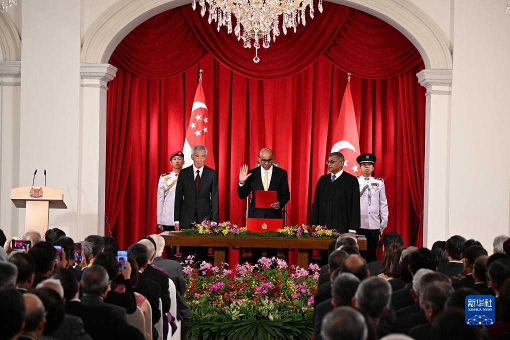9月14日,當選總統尚達曼(中)在新加坡總統府宣誓就職。圖自新華社
