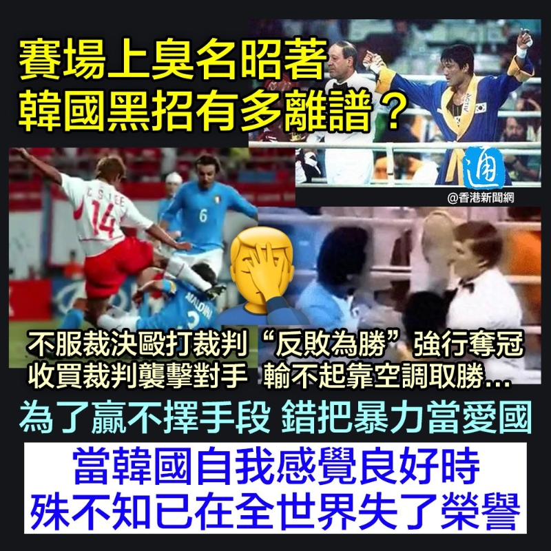 2010-2011短道速滑世界杯中,韓國選手金炳俊在試圖超越中國選手韓佳良時,二人出現碰撞摔出場外,金炳俊沒有受傷,但他抬起的腳划破了韓佳良的肚皮,韓佳良被擔架抬出。裁判判定金炳俊惡意犯規,取消其成績。 2014年仁川亞運會,韓國隊被質疑利用空調吹出來的風,來控制場上的羽毛球走向。多個國家的球員賽後反映,場館空調風力、風向在比賽中突然變化,“也太順著韓國隊的意願了”,“一輩子沒見過那麼大的風”。 韓國體育黑歷史一籮筐,不過韓國民眾似乎不以為恥、反以為榮。 前韓國足球運動員李天秀2021年自爆,02年世界杯時自己是故意踢向意大利隊長馬爾蒂尼後腦的。他大言不慚地在綜藝上稱,“我感覺意大利球員目中無人,看不起韓國球員。我踢馬爾蒂尼不是因為他的身份,而是他剛好出現在那裡。”言辭中毫無悔意。而當年那場比賽的看台上,韓國球迷拉起橫幅,上面寫著:“歡迎來到意大利隊之墓”。